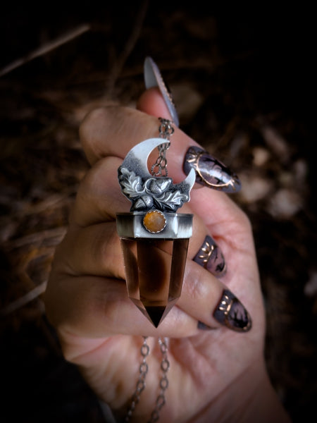 A Smoky Quartz crystal point is set in fine and sterling silver with a textured crescent moon and acorn with leaves design with a warm, golden faceted Sunstone to capture all the colors and mood of autumn