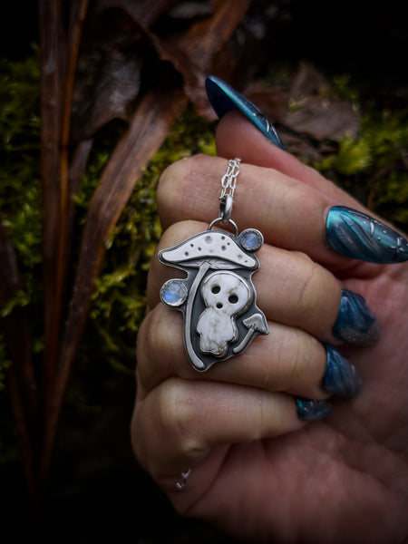 Kodama are spirits in Japanese folklore that signify that a forest is healthy, forming from old growth trees. A piece of Howlite was carved to serve as the spirit of the forest with Moonstone orbs on a pendant with sterling silver mushrooms.