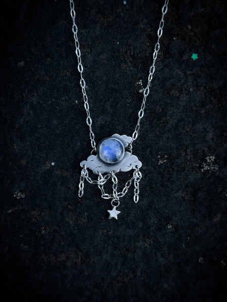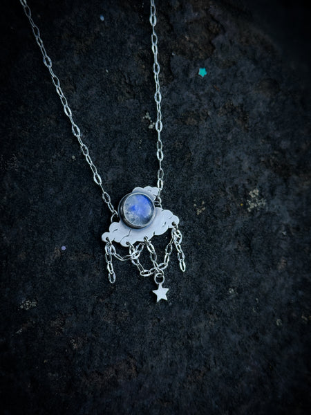 A smaller version of the Silver Linings Necklace, this petite version features a round, glowing blue flash Moonstone nestled amongst sterling silver clouds with sterling silver chain and star charm suspended below.