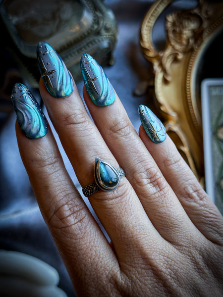 A flashy Labradorite is captured upon a Sterling silver dragon scale band. This is a size 6.5 Ring. Ring shown in photos is sized and ready to ship.