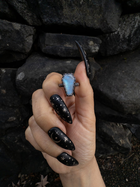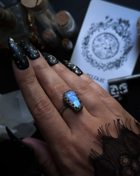Choose your desired ring size for a custom made to order Sterling silver coffin ring with a small, faceted Moonstone coffin shaped stone. Examples of stones are pictured here, one will be chosen for you from my collection and made in the style of the example shown with an antique, Victorian inspired patterned band.